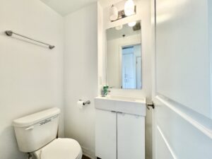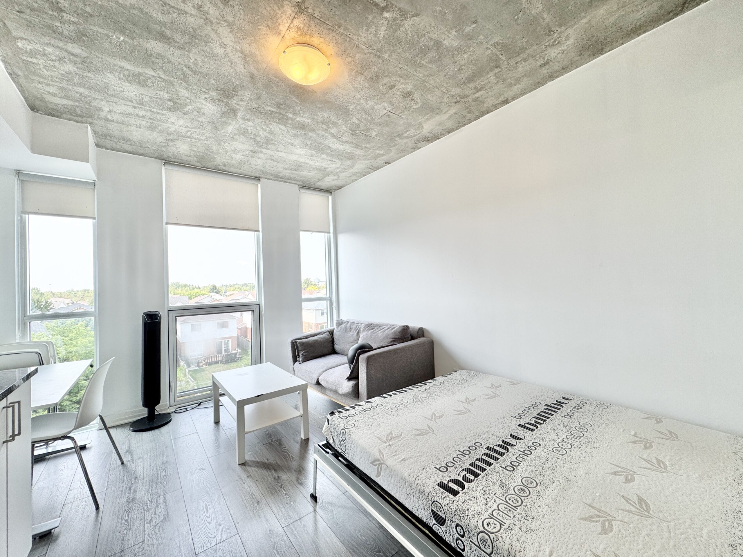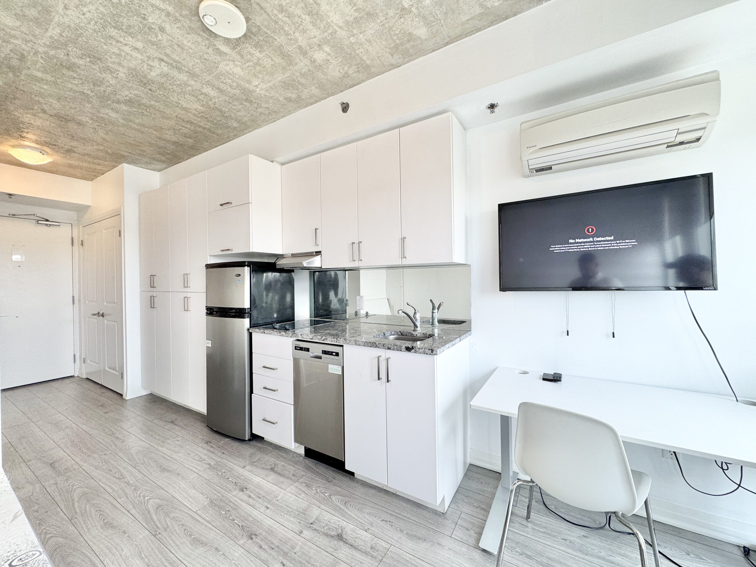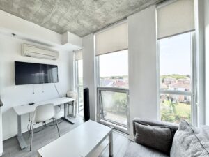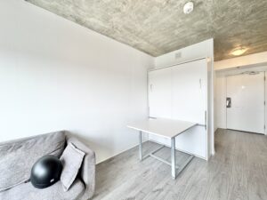 • Fully furnished, move-in ready with: Murphy bed/table combo, sofa, coffee table, desk & chair, 45″ smart TV