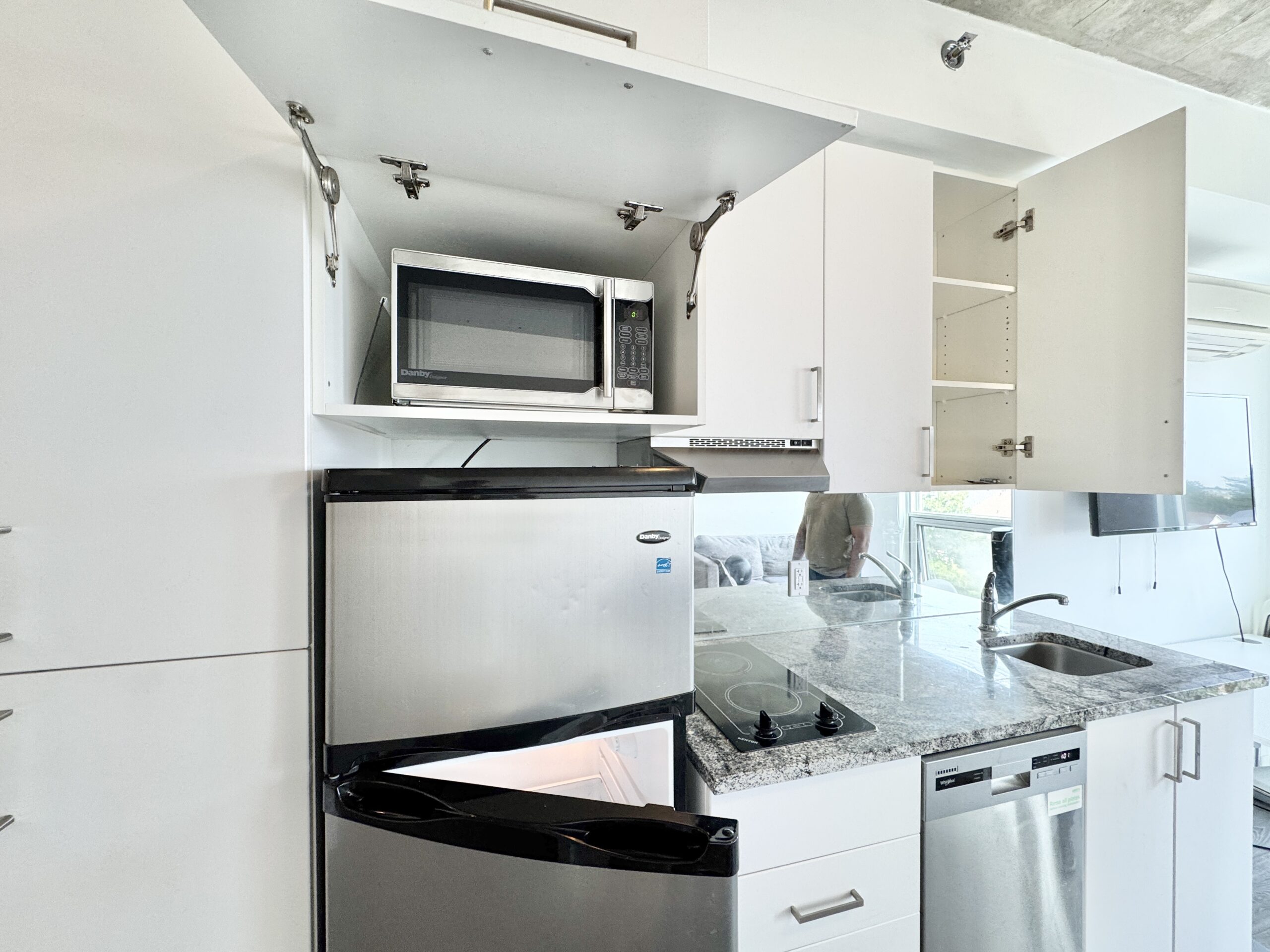 • Kitchenette includes stainless steel fridge, electric cooktop, microwave, dishwasher, quartz/granite counters with backsplash